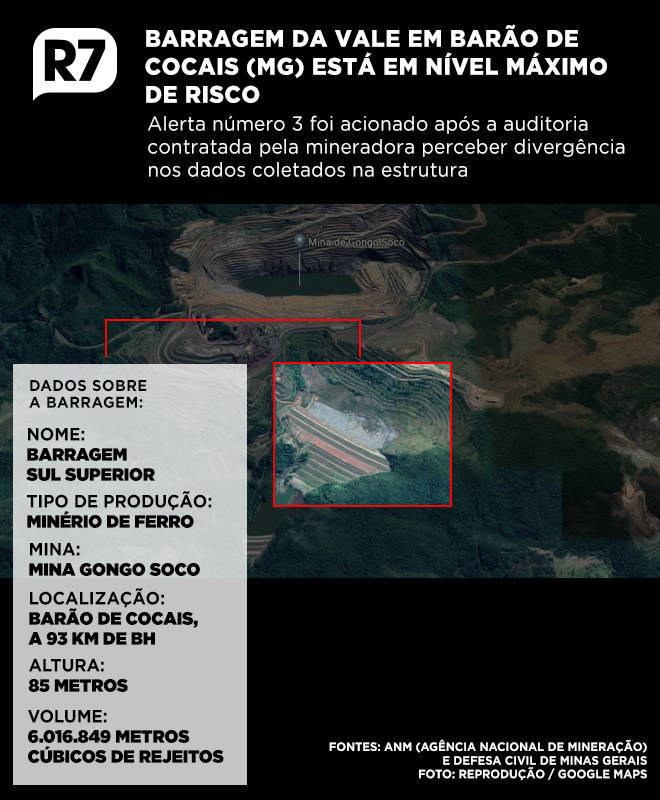 O nível de alerta da estrutura foi elevado para o grau máximo (3), no final da noite desta sexta-feira (22), após a empresa de avaliação contratada pela Vale não atestar a segurança da barragem.